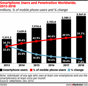 eMarketer表示:到2018年年底,智能機(jī)將占據(jù)全球手機(jī)市場份額的51.7%,而功能機(jī)反而會(huì)成為“少數(shù)”。當(dāng)然,這要?dú)w功于新興市場互聯(lián)網(wǎng)接入費(fèi)用的下降、以及智能機(jī)價(jià)格的逐年下降。