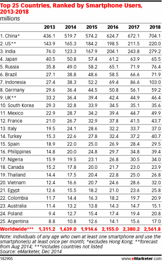 相比之下,美國當(dāng)前僅有1.653億智能機(jī)用戶(排名第二),而印度(排名第三)2013年的智能機(jī)用戶也只有7600萬(但是會(huì)在2018年增長到2.792億)。